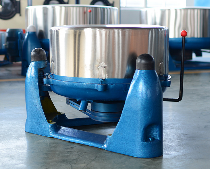 脫水機 (甩干機) 為三足懸擺式,可避免因轉鼓內不平衡而在運轉時產生地腳振動。外殼和頂蓋系鋼板所制,底盤材料為鑄鐵,出水管在底盤下方,底腳座及柱腳材料均為鑄鐵。主軸采用優質鋼材所制,裝有多只軸承,下端用推力球軸承支持,以減少磨損,節省動力。轉鼓采用不銹鋼板鈕孔制成,籠底座為鑄鐵件,并襯有不銹鋼罩。轉鼓裝在主軸上端的錐面上,以保證運轉平穩。本脫水機采用來獨立的電動機用過三角帶傳動,大規格的裝有離心式起步法蘭,可使機器緩步起動,其制動效率高,能使轉鼓迅速停止轉動,可避免主軸因制動而受到扭力。