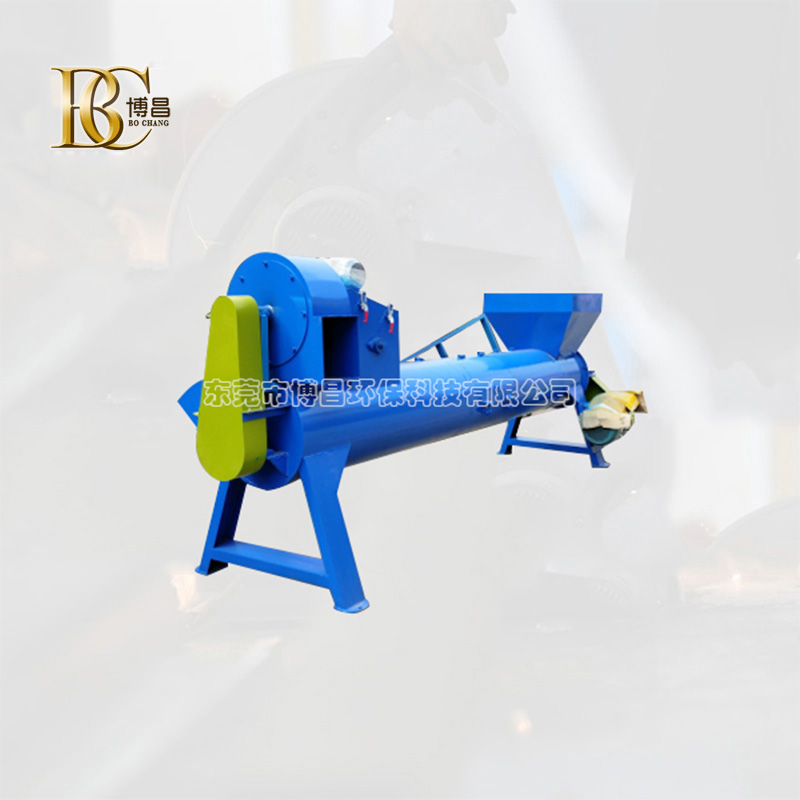 瓶料自入料,主軸上裝有116把合金葉片與主軸中心線有一定的夾角和螺旋線旋轉,將PET瓶向出料端輸送,葉片上的合金刀顆將標簽剝離,出口處有風箱分離室將剝離的標簽與PET瓶身分離,標簽紙從右邊的口吹出,PET瓶直接落下 。