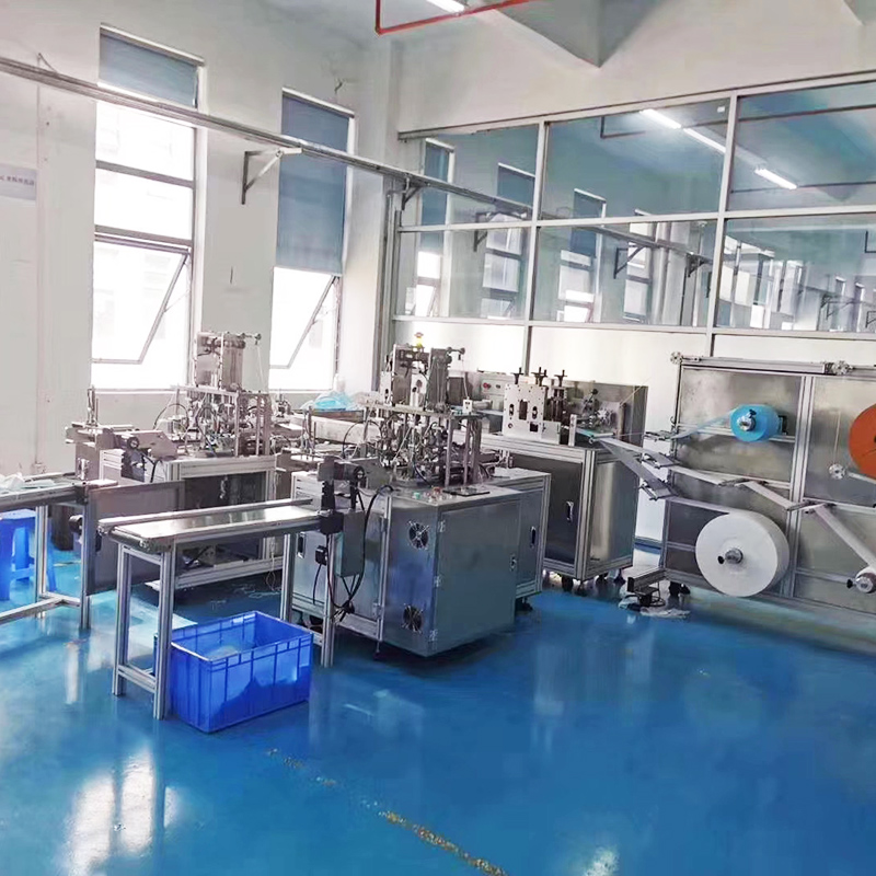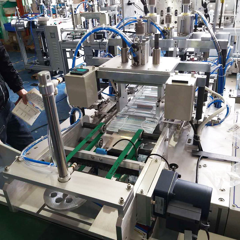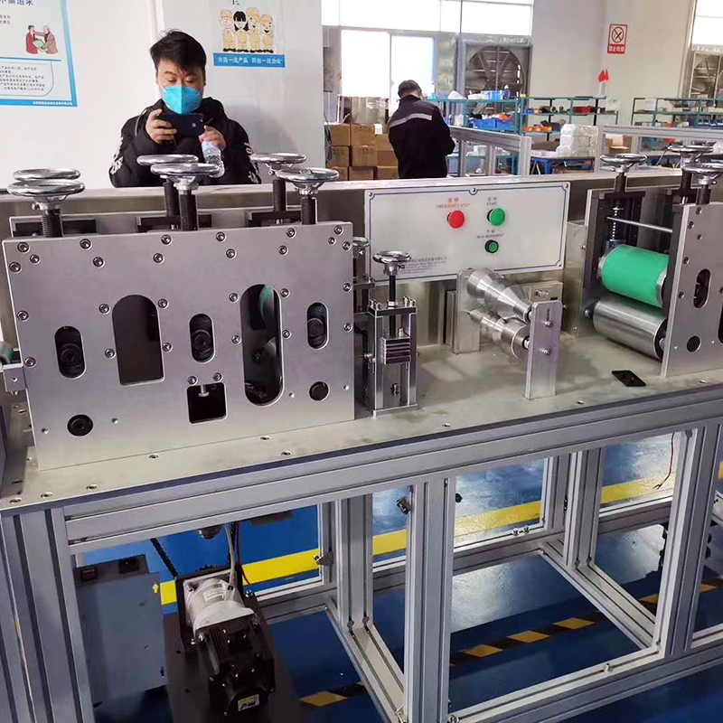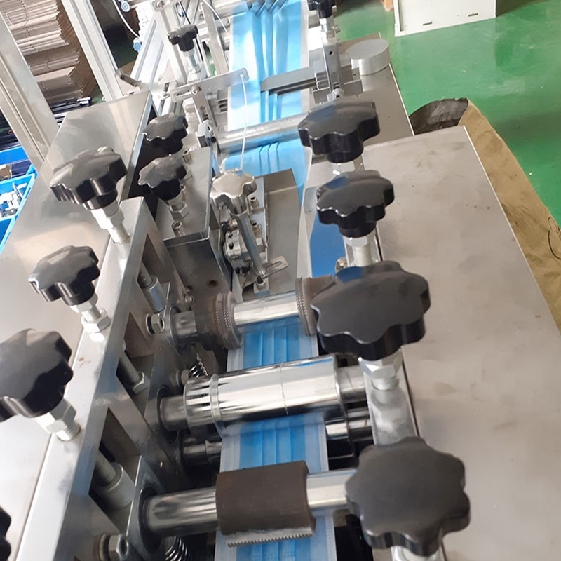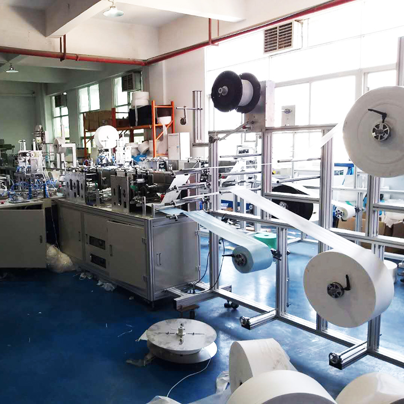 This machine is mainly used for automatic forming of flat face mask: the whole roll of cloth is driven by roller after unwinding, and the cloth is folded and wrapped automatically; the nose beam is pulled and uncoiled by the whole roll, cut to a fixed length and then imported into the wrapped cloth, and the two sides are welded to the seal by ultrasonic welding, and then sealed laterally by ultrasonic, and then cut and formed by cutter; the cloth is wrapped by assembly line The mask is delivered to two mask ear belt welding stations, and finally formed by ultrasonic welding; when the mask is made, it is delivered to the flat belt line through the assembly line for collection.